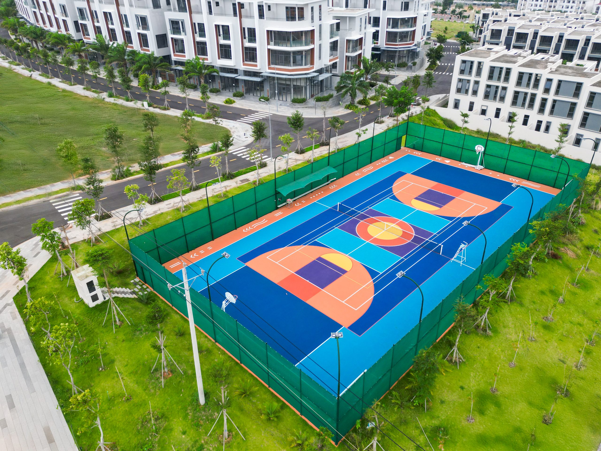 Dành cho tín đồ thể thao và hoạt náo, sân thể thao đa năng là nơi lý tưởng “bắn” bóng, tập nhóm hay challenge vui vẻ cùng bạn bè – vừa rèn luyện vừa gắn kết tinh thần đồng đội. Sân kết hợp nhiều bộ môn: Tennis, Pickle ball, Bóng rổ,…